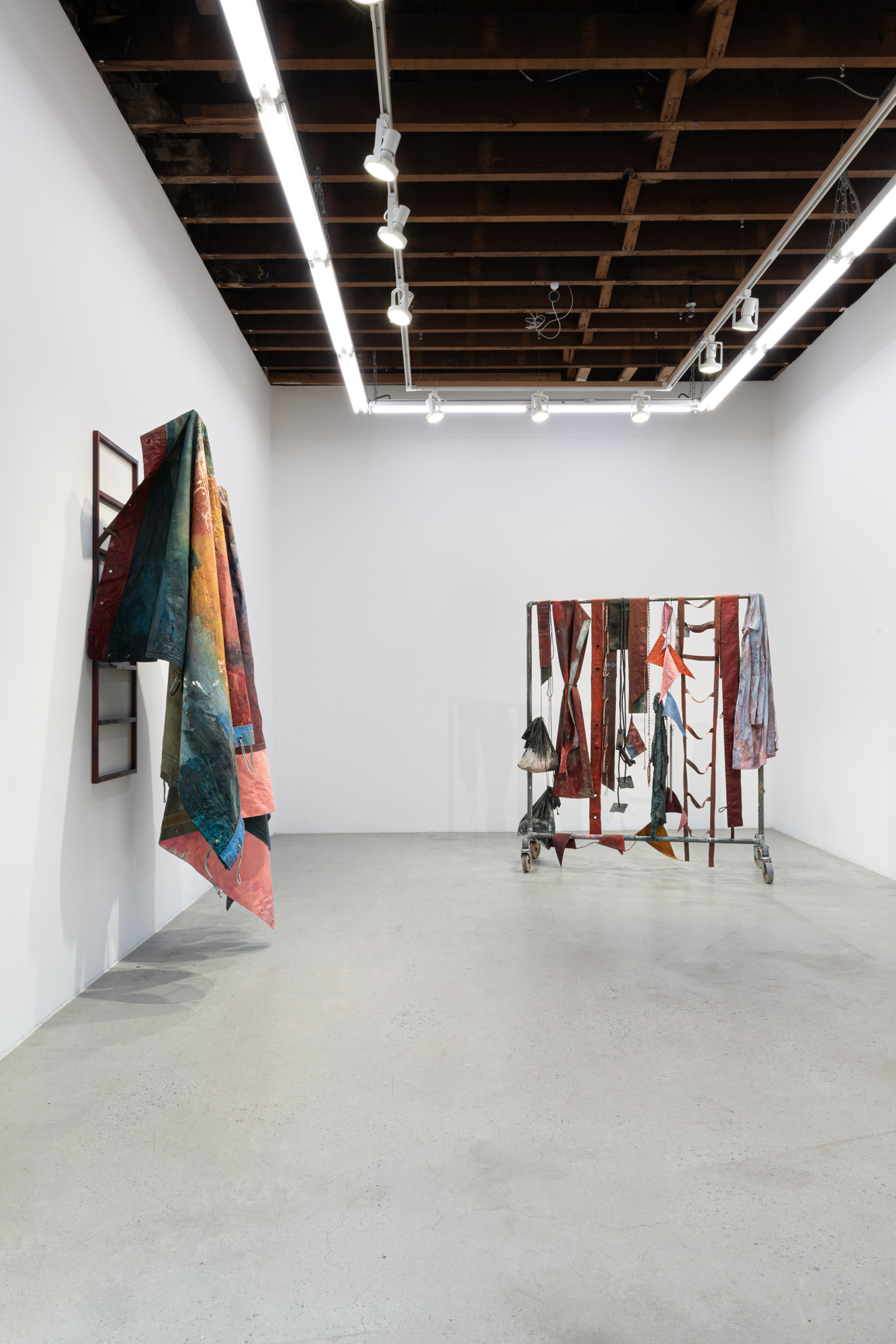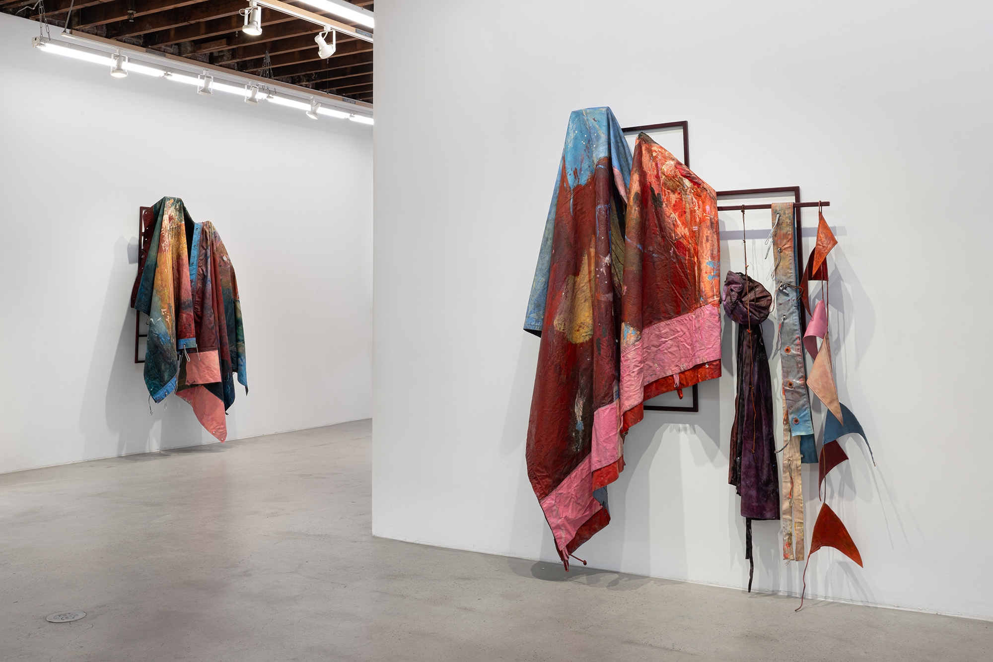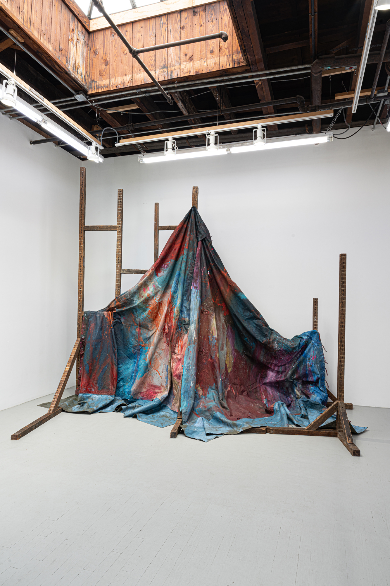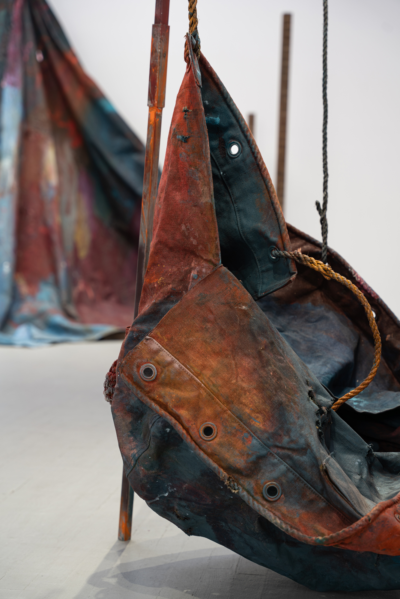 Each sculptural assemblage is comprised of found materials and objects that carry the weight of their abandoned lives. Like us, they have memories. Dennis tells me that she sources military tents from the North of England, and when they arrive at the studio, they’re covered in mud. Their memory of that landscape and their former function as shelters against its inhospitable weather leaves a palpable material trace. Dennis washes the fabric carefully before she begins to paint. But the sculptures that arise from this process remember their origins in small yet evocative details. Zips, buckles, rivets, fastenings and toggles that once gave the tent its three-dimensional shape remain visible at the sculptures’ edges. On fabric that now recalls sumptuous Renaissance drapery, they are moments of recognition, an abstract visual language of their own, distinct from the painterly gestures that cover the surface they frame. These structural elements remind us where the tent might be entered and give the sculptures the feeling of dens—the haphazard, furtive sanctuaries of childhood—even in their current state, in which fabric clings to the wooden and metal spokes with an air of dilapidation.